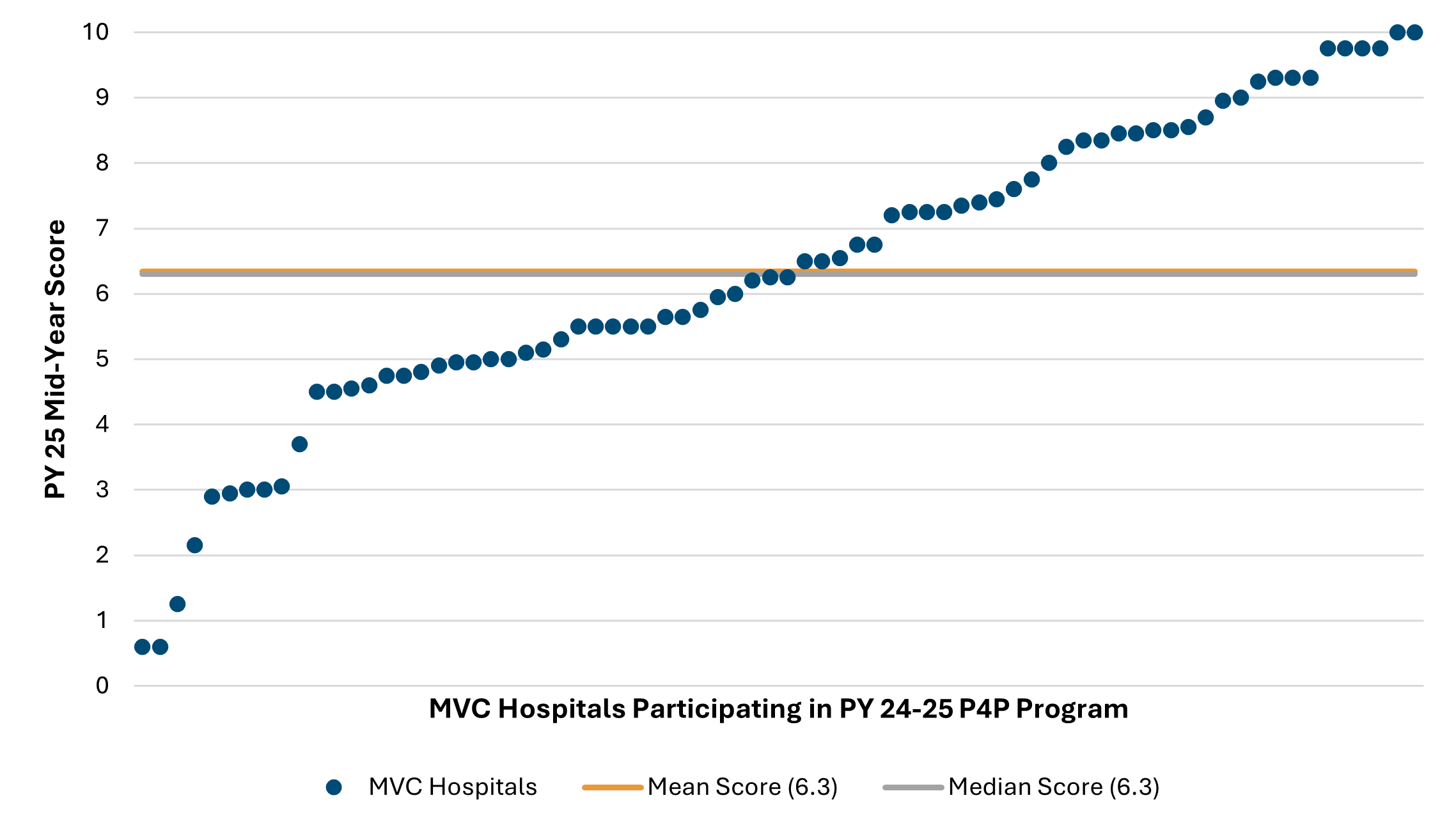 These PY 2025 P4P mid-year scores are subject to change as new data is added. The final scores will be distributed after all 2024 claims are incorporated into the calculations. Hospitals can track their score via the P4P PY 2024-2025 dashboard reports on the MVC registry, which provides all relevant scoring information for both improvement and achievement points. These registry reports can be filtered by selected conditions/metrics to make tracking of P4P points easier. You can also contact the MVC Coordinating Center [EMAIL] for a walkthrough of your hospital’s PY 2025 mid-year scorecard or P4P registry reports.