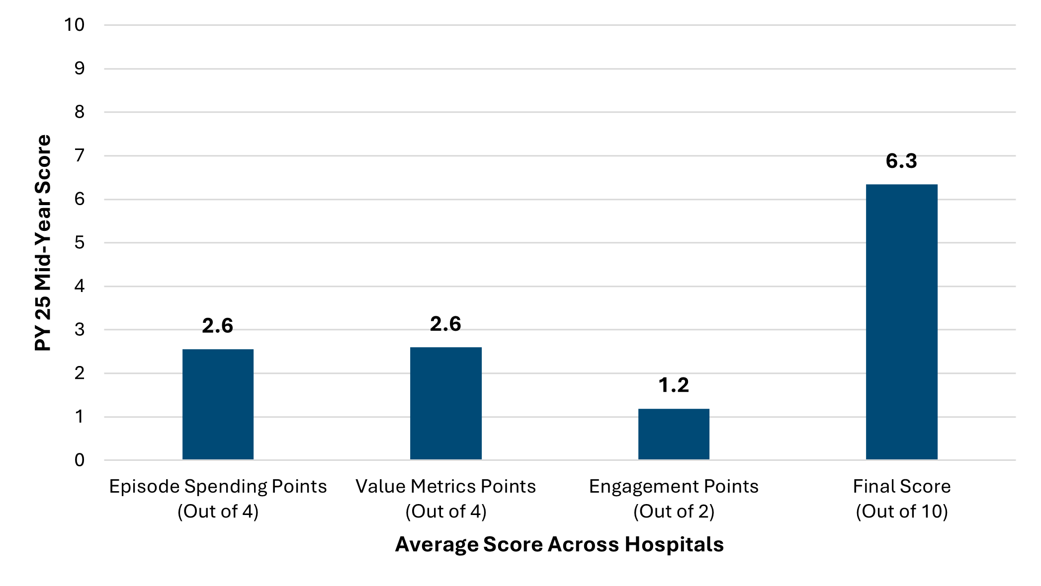 Each hospital received a mid-year score out of a total of 10 points, including 0 to 4 points for their selected total episode payment metric, 0 to 4 points for their selected value metric, and 0 to 2 points for completed eligible engagement activities. PY 2025 scores achievement and improvement points for each hospital’s selected episode spending conditions and value metrics using index admissions from 2024 performance year data against admissions in 2022 as the baseline year. Hospitals are awarded the higher of their achievement and improvement point scores.