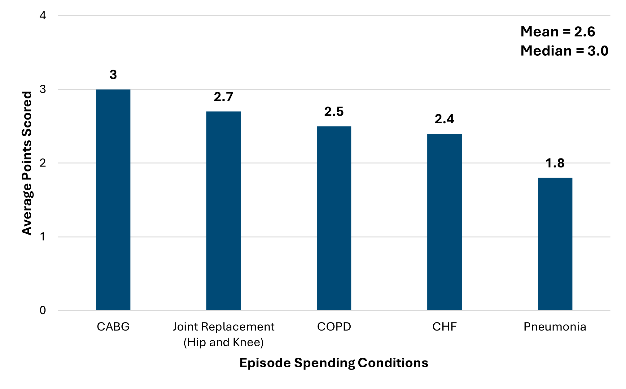 Figure 3 illustrates the breakdown of the average points by episode spending conditions. Coronary Artery Bypass Grafting (CABG) was the highest scoring episode spending condition with an average of 3 points, and this was closely followed by joint replacement with 2.7 points. The lowest scoring episode spending condition was pneumonia with hospitals earning less than 2 points on average.