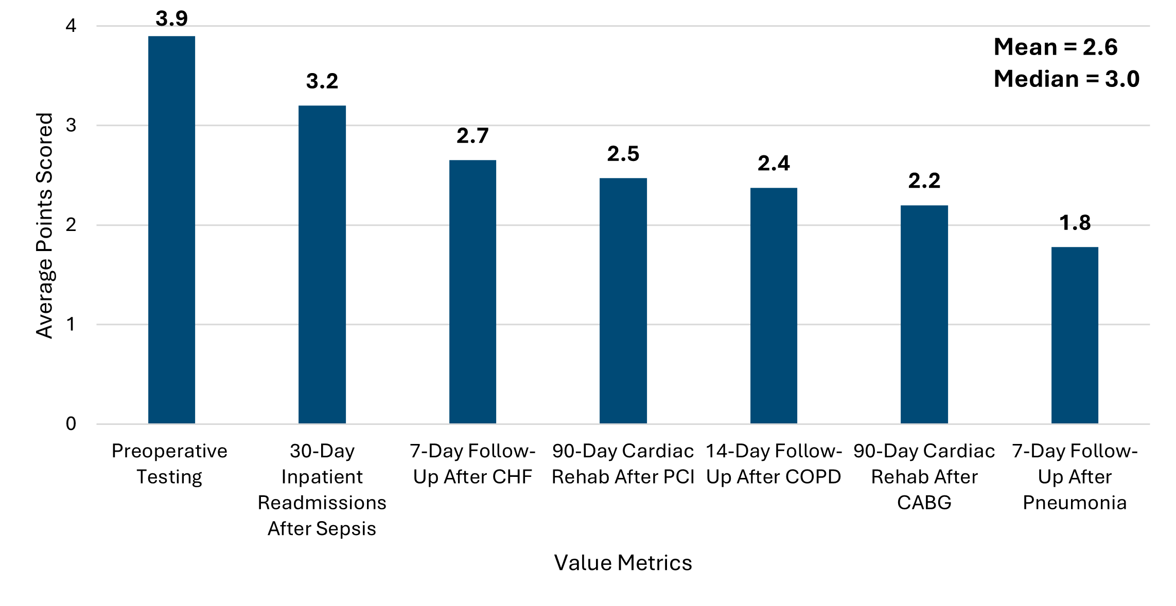 Figure 4 illustrates the breakdown of average points by value metrics. Consistent with PY 2024, the highest scoring value metric was preoperative testing with 3.9 points followed by 30-day inpatient readmissions after sepsis with 3.2 points. The lowest scoring value metric was 7-day follow up after pneumonia and follows the same trend as that of PY 2024 with 1.8 points.
