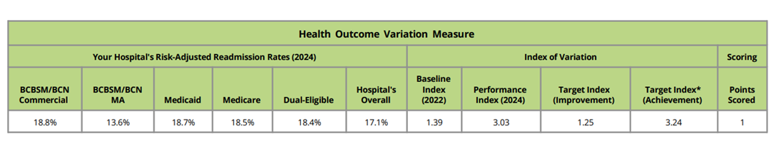 In addition to the PY 2025 mid-year scorecard summary, this report also included a preview of the new health outcome variation measure scoring, which will be worth one point in PY 2026-2027 (Figure 5). The table presents the hospital’s payer-specific risk-adjusted readmission rates in the performance year, the baseline and performance indexes for the hospital, and the target indexes required to score a point via improvement or achievement. This table’s scoring is based on PY 2025 data (i.e., 2024 performance year data and 2022 baseline data). Please note that this table was included to help orient members to the scoring methodology for this new measure and does not impact PY 2025 scores. For detailed information about this measure, please refer to this introductory video and PY 2026-2027 P4P technical document.